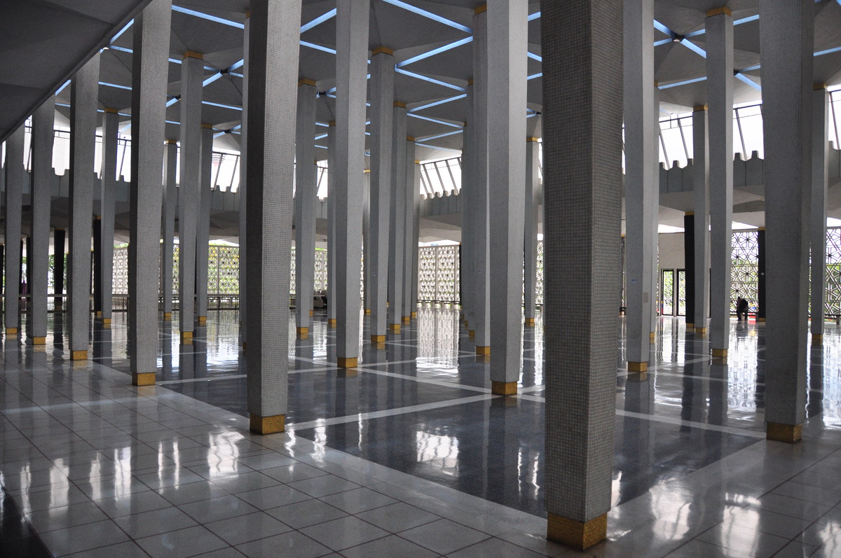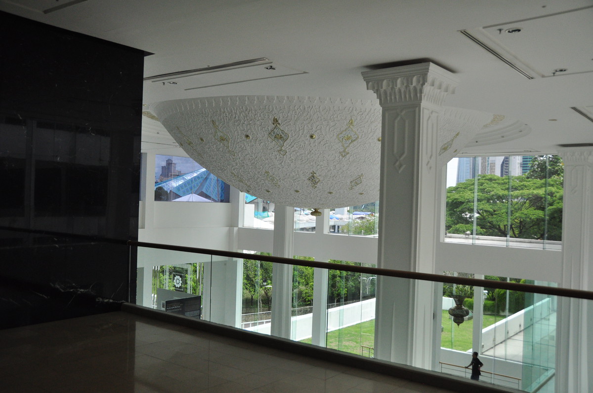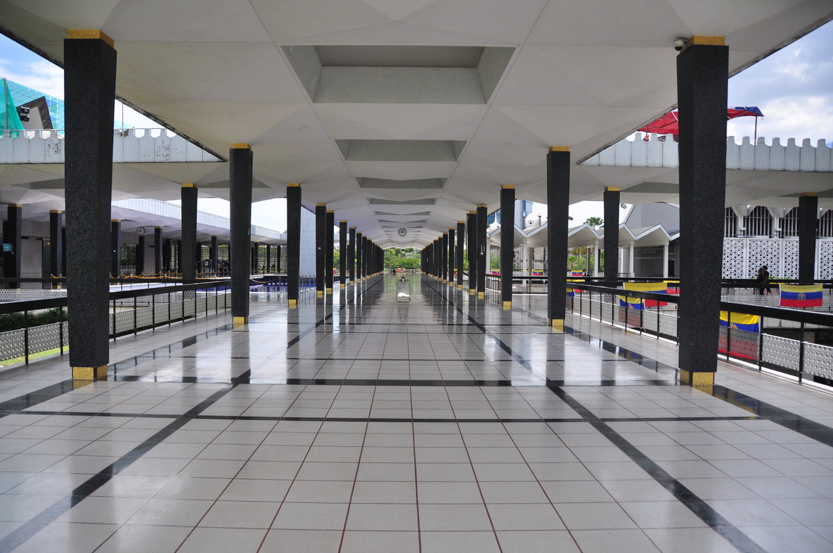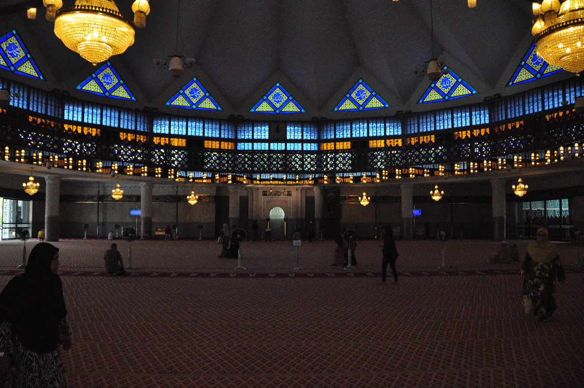 Nach dem Besuch im Bahnhof wollten wir ins Museum für Islamische Kunst, haben aber noch einen kurzen Abstecher in die Nationale Moschee gemacht. Man sollte darauf achten, dass man nicht während den Gebetszeiten zu besuch ist, da dann der Zutritt für Touristen teilweise gesperrt ist. Es hat Infobroschüren, welche drängende Fragen zu Kopftuch, Rolle von Frauen und Männer in der Gesellschaft sowie Dschihad, etc beantworten sollen. Es hat auch einige Volunteers, welche geduldig (und meist mit Elan) Fragen beantworten. Es ist eine gute Gelegenheit um Vorurteile abzubauen (und zu bestätigen) und mehr über den Islam zu erfahren. Ich kam zum Schluss, dass es genau gleich wie beim Christentum wohl einfach auf die mehr oder weniger radikale Auslegung geht. Während die Leute in Malaysia tendenziell eher religiöser sind als in der Schweiz, sind alle dennoch sehr tolerant, was wohl auch ermöglicht, dass Kirchen, Moscheen, Buddhistische Tempel und Hinduistische Tempel beinahe nebeneinander stehen, ohne dass es zu grösseren Konflikten kommt. Es gibt allerdings auch andere Sichten, so haben Buddhisten und Christen in Malaysia scheinbar ähnliche Sorgen wie die SVP in der Schweiz und fürchten, dass die radikaleren Moslems versuchen die Sharia ins Gesetz zu integrieren und teilweise auch auf nicht Moslems anzuwenden. Die meisten Einheimischen sprechen jedoch nicht gern über solche Themen.