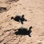 Nachdem wir einen Tag lang die faszinierende Umgebung der riesigen Farm erkundet haben, machen wir Tags darauf einen dreistündigen Ausritt mit zwei Parkwächtern in den iSimangaliso Wetland Park der direkt über die Strasse liegt. Auch hier gibt es keine Elephanten und Nilpferde, dafür verschiedene Antilopenarten wie Impalas und Nyalas. Ebenso spannend ist das Aufeinandertreffen von Fluss und Meer und die einzigartige Marschlandschaft die dabei gebildet wird. Wir lernen, dass es hier auch Wildschweine und Leoparden gibt, die auch auf das Gelände der Farm kommen. Wir sehen dann auch tatsächlich ein Wildschwein aber vom Leopard finden wir nur Pfotenabdrücke im Sand.